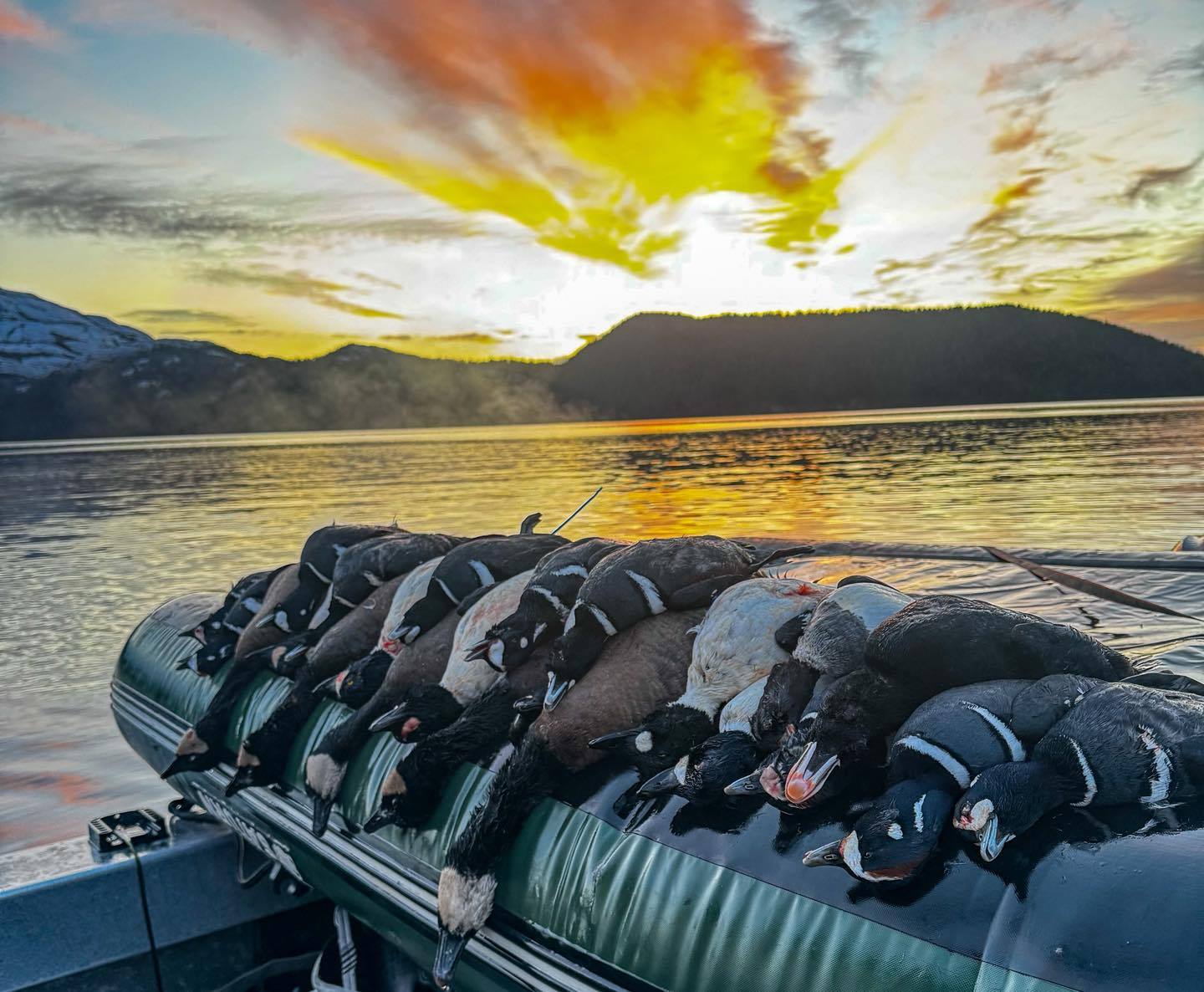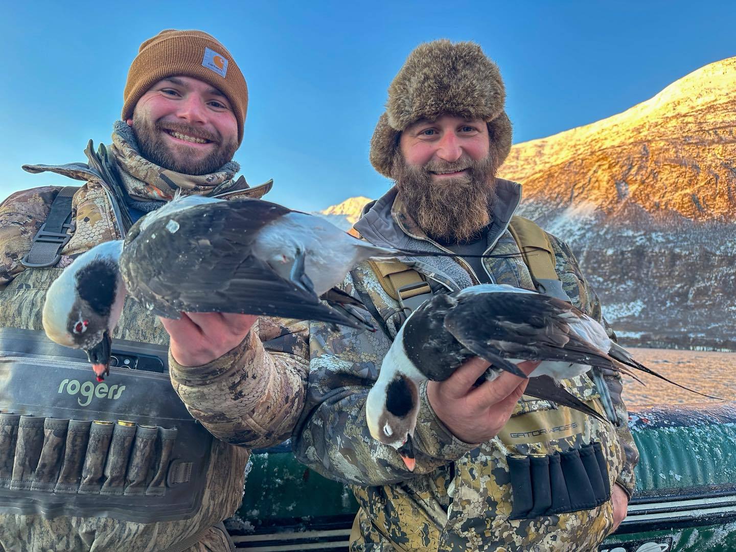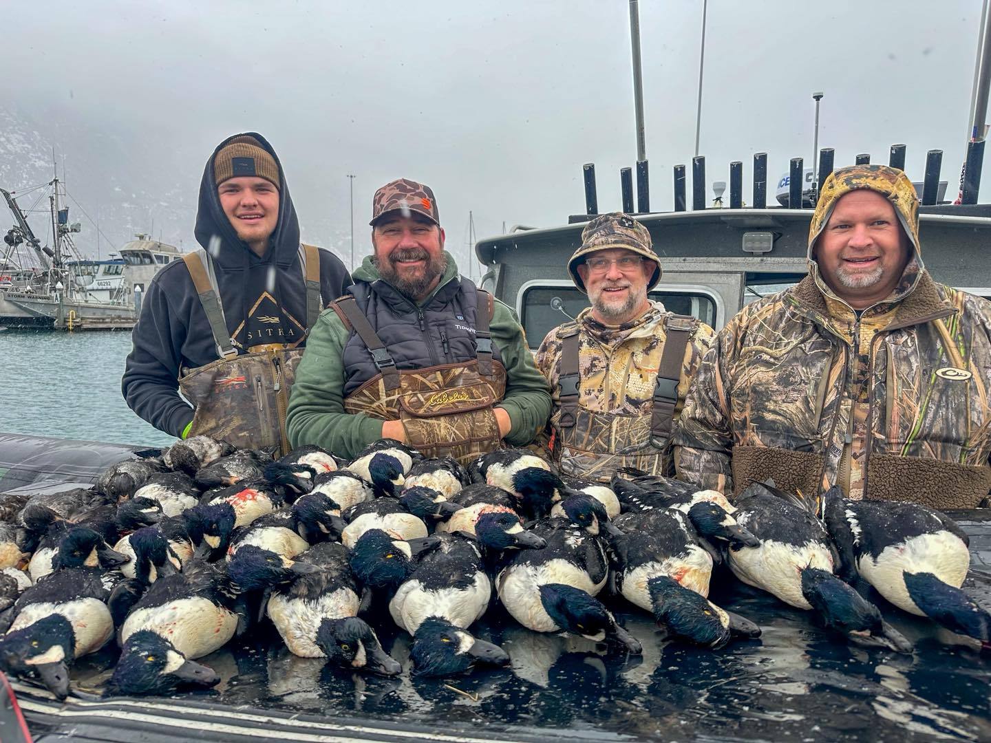 Your days will begin with a filling hunter’s breakfast before you depart for a full-day hunt in the beautiful Port of Valdez with one of our experienced guides. We run two groups at a time with a guide for each group. You will be out from the opening of shooting time to the close in order to ensure bagging your trophies. Each day you will hunt a different area depending on the species you are targeting. We have a variety of hunting techniques that we use from shore blinds to layout boats. We are very mobile and work hard at getting the birds you are after. You will enjoy a full lunch aboard the boat and when you return in the evenings, explore the quaint town of Valdez with one of the AWA cars while having dinner at one of the many fine restaurants in town.